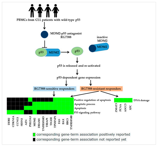 We have previously reported the concentration-dependent cytotoxic effect of the second-generation small-molecule inhibitor of the p53–MDM2 interaction, idasanutlin (RG7388), on ex vivo-tested TP53WT primary chronic lymphocytic leukemia (CLL) patient samples, when compared with normal hematopoietic and bone marrow cells, and TP53MUT CLL cells [2]. RG7388 was the first MDM2–p53-binding antagonist to progress through phase II clinical studies (ClinicalTrials.gov identifier: NCT02633059). According to preliminary clinical trial outcomes, RG7388 offers potential as a therapeutic drug for leukemia [3]. However, the CLL cell response to MDM2 inhibitors varies considerably, and although dependent on the TP53 mutational status, it also shows variation across TP53WT samples. SF3B1 mutations in CLL patient samples were found to be associated with resistance to treatment with RG7388 ex vivo, and patients with the wild type for both SF3B1 and TP53 are most likely to benefit from treatment with MDM2 inhibitors [4]. To further explore the mechanisms involved in the differences in drug responses, RNA-seq analysis was carried out on a selection of TP53WT primary CLL samples either resistant or sensitive to the MDM2 inhibitor RG7388, to define differentially expressed genes and pathways activated by RG7388 compared to untreated controls. The main objective in this study was to identify potential response biomarker signatures as well as possible novel targets for combination treatments.