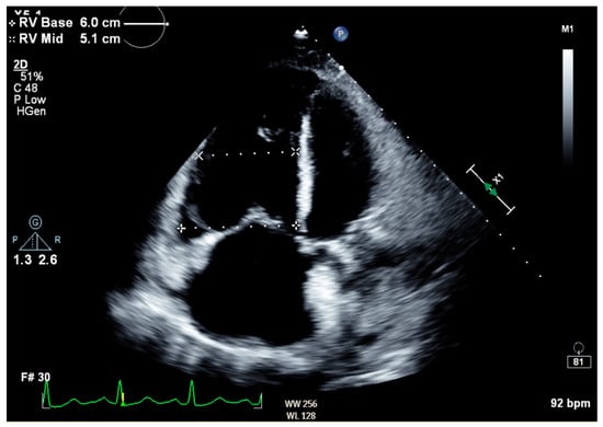 Figure 1). Doppler imaging of the liver showed patent vessels. Repeat TTE on this admission showed a preserved EF of 65% with paradoxical septal motion, flattened interventricular septum, and severe right ventricular (RV) enlargement consistent with RV pressure/volume overload. The pulmonary systolic pressure was estimated at 74 mmHg (