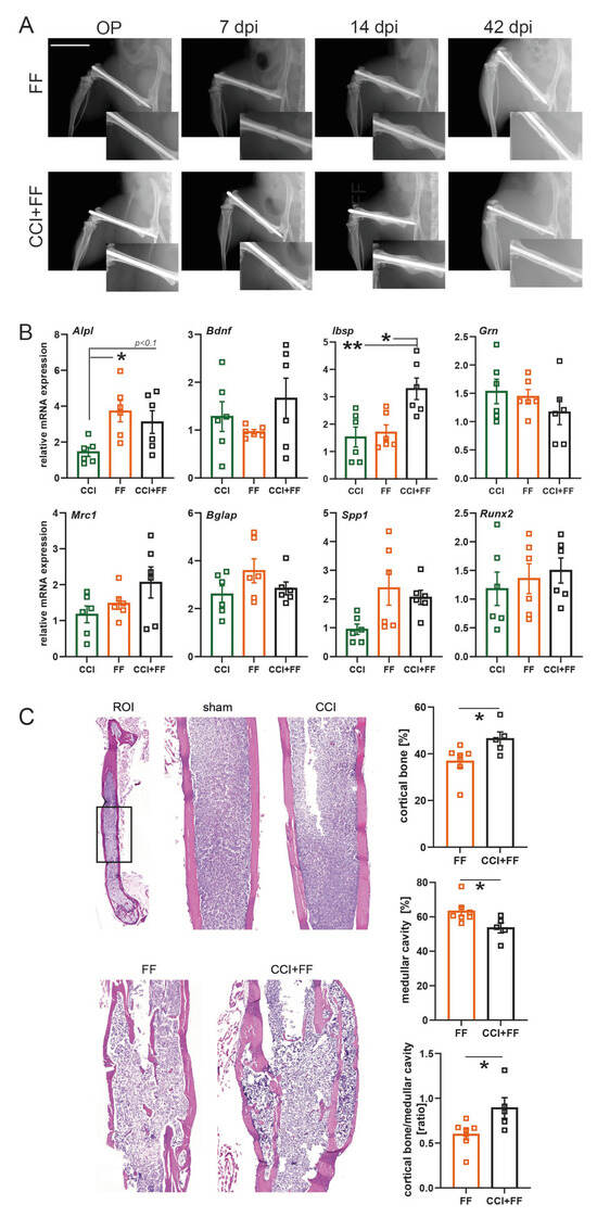 First, we investigated efferent effects of brain-to-bone crosstalk, as clinical and experimental studies have reported enhanced bone healing processes associated with TBI [7,8]. Gene expression associated with inflammation, bone metabolism, and repair [31] was analyzed by qPCR in femoral bone tissue (Figure 2B). While Bdnf, Grn, Mrc1, Bglap, Spp1, and Runx2 mRNA expression was not significantly altered among CCI, FF, and CCI+FF mice. Alp expression was increased in animals with femoral trauma compared to isolated CCI (FF: 3.72 ± 0.59; CCI: 1.45 ± 0.26; mean ± SEM, p = 0.0230) and tended to be reduced in the fractured bone by CCI (CCI+FF: 3.12 ± 0.63; CCI+FF vs. FF: p = 0.0778). Remarkably, BSP gene expression (encoded by Ibsp) was significantly increased in mice with combined trauma, CCI+FF as compared to isolated CCI (CCI+FF: 3.29 ± 0.39; CCI: 1.53 ± 0.36; mean ± SEM, p = 0.0080), and FF (1.70 ± 0.27; mean ± SEM, CCI+FF vs. FF p = 0.0111).