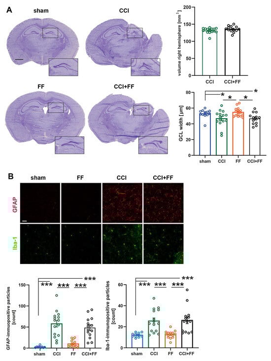 At 42 dpi, brain histopathology was examined using volumetry of brain hemispheres and the hippocampal granule cell layer (GCL) width was determined (Figure 3), a brain region affected by secondary injury in the CCI model of TBI [38]. CCI produced substantial tissue loss in the ipsilesional hemispheres, but the volume of the remaining brain tissue in the lesioned hemispheres was comparable between the two groups with cerebral trauma (CCI: 131.4 ± 2.04; CCI+FF: 135.8 ± 2.45, mean ± SEM, CCI vs. CCI+FF: p = 0.3124). GCL width was reduced in the lesioned hemispheres (CCI: 46.80 ± 2.62; CCI+FF 46.85 ± 1.97, mean ± SEM) compared to sham (52.96 ± 1.59; mean ± SEM, CCI vs. sham: p = 0.0432; CCI+FF vs. sham: p = 0.0432) and FF (54.85 ± 1.45; mean ± SEM, CCI vs. FF: p = 0.0207; CCI+FF vs. FF: p = 0.0246), as expected, but not different between the groups subjected to CCI or CCI+FF (CCI vs. CCI+FF: p = 0.9873) (Figure 3A).