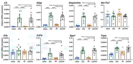 Gene expression in the perilesional brain tissue of the lesioned hemisphere was analyzed by qPCR using a panel of inflammation-associated markers predominantly expressed by astrocytes or microglia (Figure 4). We observed highly significantly increased expression of all marker genes at 42 dpi in CCI or CCI+FF mice as compared to sham or FF, respectively (Tspo, Gfap, Cd74, C3, Serpa3n, Spp, all p < 0.001). However, femoral fracture had no influence on late TBI-induced gene expression of inflammation-associated markers.