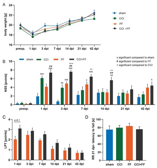 After completion of surgical procedures, mice were transferred into their cages and placed into a neonatal incubator (Babytherm 8000, Draeger, Luebeck, Germany) for two hours and then returned to their home cages. The sham procedure included analgesia, anesthesia, and skin incisions as described above without further surgical intervention; management and duration of anesthesia as well as perioperative parameters were upheld identical in all groups. Mice were screened for early termination criteria-predefined as ≥20% loss of initial body weight and/or exhibiting signs of severe pain or discomfort in accordance with national and international recommendations—several times daily. Overall mortality rate was 1.75% (one CCI+FF mouse deceased 14 dpi), and no animals fulfilled the early termination criteria.