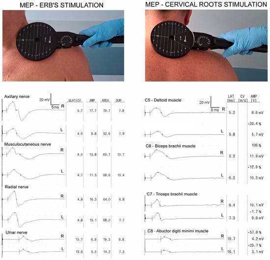 Photographs presenting the placement of the magnetic coil during MEP studies after stimulation at Erb’s point, with transvertebral as well as MEP recordings of both sides (R—right, L—left), respectively, with the amplitude (AMP), latency (dLAT, LAT), and duration (DUR) of the evoked potentials presented.