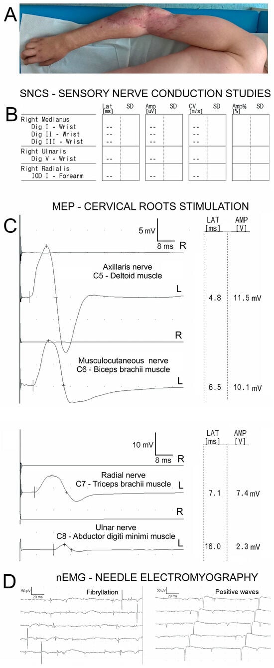 Examples of results from the sensory nerve conduction studies (B), MEP recordings after the magnetic stimulation of the cervical roots (C), and spontaneous activity during needle electromyography tests (D), showing denervation potentials (fibrillation and positive waves). These relevant results were obtained in a patient (A) with a total brachial plexus injury and cervical root avulsion on the right side. Abbreviations: N—nerve; Musculocut.—Musculocutaneous nerve; ADM—abductor digiti minimi muscle; C5–C8—cervical root levels.