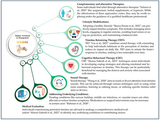 Tinnitus management encompasses various strategies to alleviate symptoms [7], including sound therapy, cognitive behavioral therapy, relaxation techniques, and the use of hearing aids or masking devices [15,16]. The approach to treating and managing tinnitus varies based on the underlying cause and individual factors [17]. While there is currently no known cure for tinnitus, numerous approaches exist to alleviate symptoms and enhance quality of life [18]. Figure 1 presents the common strategies employed to manage tinnitus across all age groups.