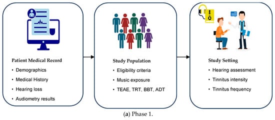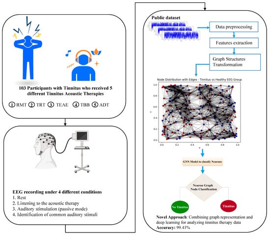Figure 4 shows the process of administering acoustic therapy for one hour per week while monitoring the EEG signals. During the EEG session, the patients engaged in various activities. Additionally, the control group consisted of healthy participants without tinnitus. The other group comprised patients who experienced tinnitus.
