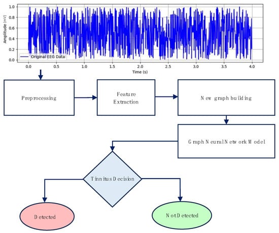 Here, we present a novel method for predicting tinnitus using a graph-based approach with EEG signal representations. The innovation lies in transforming the various channels of EEG signals into a novel graph network representation. This method ensures that all original information from the EEG data is preserved, enabling a comprehensive analysis that maintains the integrity of the multi-channel signal inputs. The dataset employed in this study was sourced from a publicly available benchmark. Initially, features were extracted from the EEG signals, followed by the construction of a graph based on these features. Subsequently, a model based on Graph Neural Networks was applied to acquire the representations of tinnitus. The entire tinnitus detection process is shown in Figure 3.