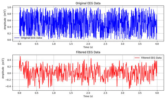 where denotes the filtered EEG signal at time , represents the input EEG signal after passing through the Butterworth filter, is the impulse response of the filter, and the integral signifies the convolution operation between the filtered signal and impulse response. Figure 5 depicts the application of a filter to EEG signals. The blue curve represents the original data, whereas the red curve shows the data after the filtering process, indicating the cleaned or processed signals.