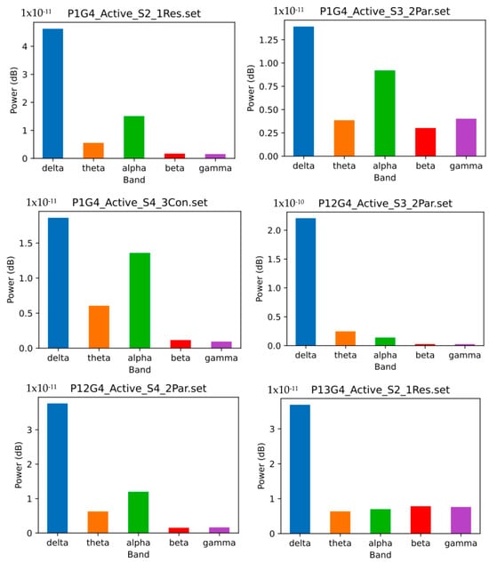 Moving to the frequency domain, we estimated the power spectral density (PSD) of the signal. The PSD represents the distribution of power across different frequencies. From the PSD, we extracted the maximum frequency, which corresponded to the frequency with the highest power. In addition, we computed the mean frequency by averaging the product of the frequencies and their corresponding power values. The bandwidth was calculated by numerically integrating PSD. Figure 6 represents a plot of different PSDs from different bands on the dataset.