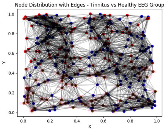 Graph G visualizing relationships among feature vectors, with nodes representing individual samples and edges denoting their connections. The tinnitus EEG group is represented by red nodes, while the healthy EEG group is represented by blue nodes.