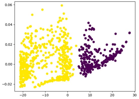 Scatter plot derived from the application of principal component analysis (PCA) on the output of our trained tinnitus detection model. Yellow dots represent the true class, while purple represent the false class.