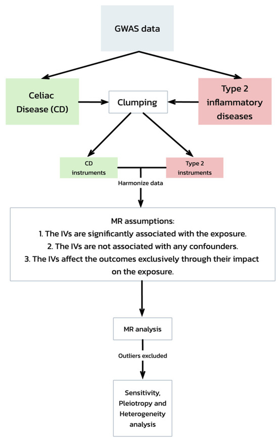 Mendelian randomization (MR) analysis workflow and assumptions. This flowchart depicts the workflow of a Mendelian randomization (MR) analysis evaluating the genetic associations between celiac disease and type 2 inflammatory diseases, starting with GWAS data. It includes steps from data clumping and harmonization to MR analysis, emphasizing the key assumptions required for the validation of the causal inferences. The process concludes with sensitivity, pleiotropy, and heterogeneity tests to ensure the robustness of the results.