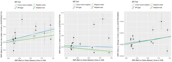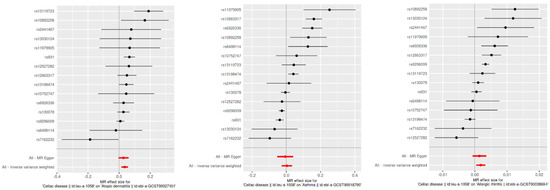 In our Mendelian randomization (MR) analysis, we used 15 genetic instruments from GWAS data to investigate the associations between celiac disease (ID: ieu-a-1058, sample size: 24,267) and three type 2 inflammatory diseases: atopic dermatitis, asthma, and allergic rhinitis and IgE-mediated food allergied. The GWAS dataset for atopic dermatitis (ID: ebi-a-GCST90027161, sample size: 796,661) included 16,121,213 SNPs, reported by Sliz E et al., 2021 [23]. The asthma (ID: ebi-a-GCST90018795, sample size: 449,500) and allergic rhinitis and IgE-mediated food allergy (ID: ebi-a-GCST90038664, sample size: 484,598, ID: ebi-a-GCST90018625, sample size: 169,716, respectively) datasets were obtained from the studies by Sakaue S et al., 2021 [24] and Dönertaş HM et al., 2021 [25], respectively.