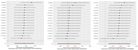 Leave-one-out sensitivity analysis for SNP effects on atopic dermatitis, asthma, and allergic rhinitis. This figure presents the results of the leave-one-out sensitivity analysis for the SNP effects on CD in relation to atopic dermatitis, asthma, and allergic rhinitis. Each plot shows the effect sizes of individual SNPs when one SNP is removed at a time, with the red line representing the overall effect estimate using all SNPs. The analysis ensures that no single SNP disproportionately influences the overall effect, confirming the robustness of our results.