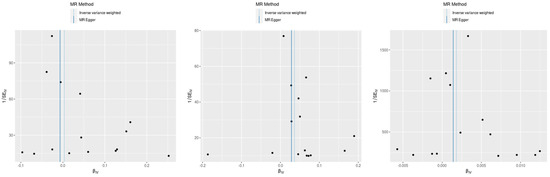 Funnel plots for assessment of publication bias in MR analyses. This figure displays funnel plots for the assessment of publication bias in the MR analyses of the SNP effects on CD with atopic dermatitis, asthma, and allergic rhinitis (left: celiac disease and asthma, center: CD and atopic dermatitis, and right: CD and allergic rhinitis). Each plot shows the relationship between the estimated effect sizes (β) and their standard errors (SE). The vertical line represents the overall effect estimate. The symmetry around this line suggests the absence of publication bias, indicating that the results are not disproportionately influenced by small-study effects or selective reporting.