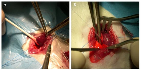 Anesthesia induction and maintenance were achieved with sevoflurane (Sevorane Abbot, Baar, Switzerland) at 5% for induction, followed by 1.5% after orotracheal intubation using an 18 G venous cannula. Analgesia was sustained with subcutaneous administration of ketoprofen (1 mg/kg). Mechanical ventilation was administered using a rodent-specific mechanical respirator (Harvard Apparatus Inspira asv, Holliston, MA, USA), delivering a mixture of oxygen and sevoflurane with a fraction of inspired oxygen of 90%, a tidal volume of 10 mL/kg, and a frequency of 80 breaths per minute. Surgical conditions were maintained with room temperature between 23 and 25 °C, insulation between the animal and the operating table using a cork panel, and an infrared lamp ensuring the animals’ thermoregulation.