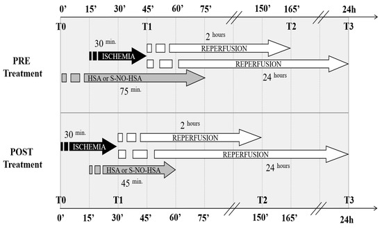 In this study, we measured the effect of NO administration via S-NO-HSA on the left ventricle in a model of standardized coronary occlusion with treatment applied before or after the onset of ischemia. The two groups (pretreatment and post-treatment) can be compared to two clinical scenarios: treatment of a coronary occlusion after ischemia onset or pretreatment before a surgical or cardiologic procedure. The effects of S-NO-HSA were tested at 2 h (T2) and 24 h (T3) after reperfusion.