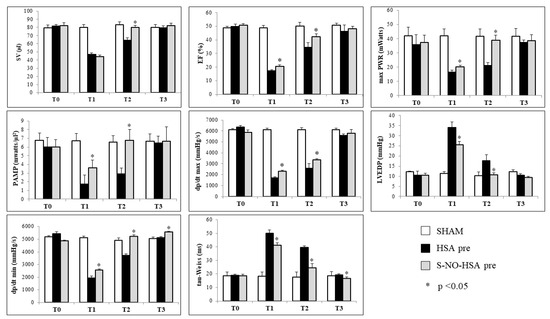 Left ventricle hemodynamic parameters pretreated S-NO-HSA and post-treated S-NO-HSA at different time points (T0, basal; T1, ischemia; T2, 2 h of reperfusion; T3, 24 h of reperfusion); * p < 0.05 pre-S-NO-HSA vs. post-S-NO-HSA. SV = stroke volume; EF = ejection fraction; max PWR = maximal power; PAMP = preload adjusted maximal power; dP/dt max = maximum increase in systolic pressure; LVEDP = left ventricular end-diastolic pressure; dP/dt min = maximum decrease in diastolic pressure; tau-Weiss = tau-Weiss time constant.