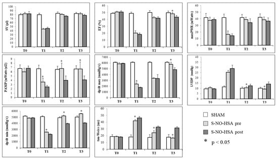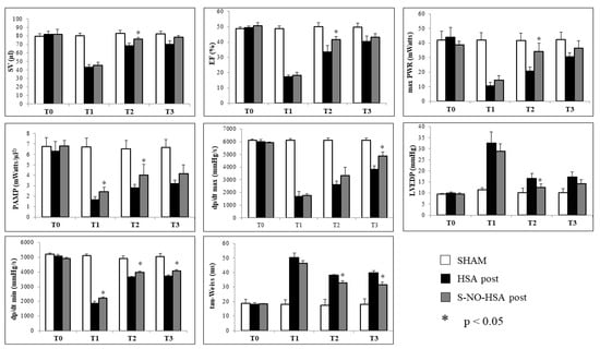 Hemodynamic data of the left ventricle during the different time points were analyzed. At T0, hemodynamic parameters reflected identical conditions across all analyzed groups (sham, pre-HSA, pre-S-NO-HSA, post-HSA, and post-S-NO-HSA), yielding no significant differences, as anticipated.