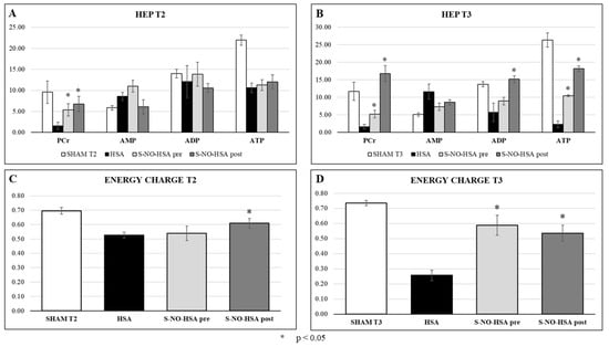 After 24 h, energy charge was significantly higher in both S-NO-HSA-treated groups compared to control (0.59 ± 0.02 pre-S-NO-HSA T3 vs. 0.54 ± 0.13 post-S-NO-HSA T3 vs. 0.26 ± 0.04 HSA T3; p < 0.05) (Figure 6 Panel C and D).