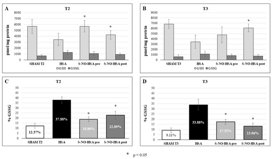 GSH and GSSG content in biopsies of the left ventricle in the treatment group receiving pre-S-NO-HSA and post-S-NO-HSA compared with the control group (HSA) at two different time points: T2 (2 h reperfusion) and T3 (24 h reperfusion). Changes in GSSG/GSH content (A,B) and the percentage of oxidized glutathione (GSSG) are illustrated (C,D); * p < 0.05 vs. HSA.