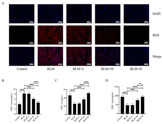 Hirudin inhibits oxidative stress in bleomycin-induced lung fibrosis. The levels of ROS in lung tissues (A).The MDA levels, GSH levels, and total SOD levels in lung tissues (B–D). BLM + H, 10 mg/kg group; BLM + M, 3 mg/kg group; BLM + L, 1 mg/kg group; BLM, pulmonary fibrosis model group; and Control, control group. All data are expressed in the mean ± standard deviation; n = 8; ** p < 0.01; and **** p < 0.0001.