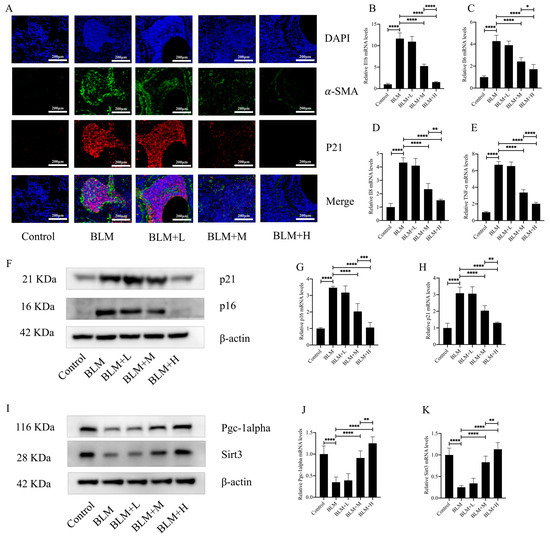 Total proteins were extracted from mouse lung tissues or cells using radioimmunoprecipitation lysates containing phosphatase inhibitors, protease inhibitors, and phenylmethylsulfonyl fluoride (Solarbio, Beijing, China). Gel electrophoresis was then performed on the proteins, followed by membrane transference to a polyvinylidene fluoride. Subsequently, the membranes were blocked with 5% skimmed milk for 2 h and incubated overnight at 4 °C with antibodies against β-actin, α-SMA, collagen I, p21, p16, PGC1-alpha, and Sirt3 (β-actin, α-SMA, PGC1-alpha, and Sirt3 obtained from Proteintech, and collagen I, p21, and p16 obtained from Abcam, Cambridge, UK). Following primary antibody incubation, the membranes were treated with the respective secondary antibody (Proteintech) for 2 h. Finally, protein expression was observed using an enhanced chemiluminescence developer.