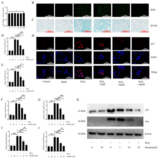 Hirudin has an inhibitory effect on hydrogen peroxide-induced senescence in fibroblasts. The effect of hirudin on the viability of fibroblasts (A). The level of ROS in fibroblasts (B). The β-galactosidase levels in fibroblasts (C). The mRNA expression levels of IL1b, IL6, IL8, and TNF-α in fibroblasts (D–G). The mRNA expression levels of p21 and p16 in fibroblasts (I,J). The expression of p21 in fibroblasts (H). The protein expression levels of p21 and p16 in fibroblasts (K). All data are presented as mean ± standard deviation, and all experiments were conducted independently and repeated a minimum of three times. * p < 0.05; ** p < 0.01; *** p < 0.001; and **** p < 0.0001.