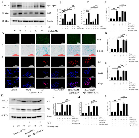 Hirudin activated the PGC1-alpha/Sirt3 pathway to inhibit fibroblast senescence. The protein expression levels of PGC1-alpha and Sirt3 in fibroblasts (A). The mRNA expression levels of PGC1-alpha and Sirt3 in fibroblasts (B,C). The levels of ROS in fibroblasts (D). β-galactosidase levels in fibroblasts (E). The mRNA expression levels of IL1b, TNF-α, IL8, and IL6 in fibroblasts (F–I). The expression of p21 in fibroblasts (J). The protein expression levels of p21 and p16 in fibroblasts (K). The mRNA expression levels of p21 and p16 in fibroblasts (L,M). All data are expressed in the mean ± standard deviation, and all experiments were conducted independently and repeated a minimum of three times. ** p < 0.01; **** p < 0.0001.