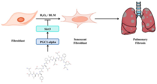 IPF is an age-related disease that commonly occurs in older individuals [4,5]. Although the specific etiology and pathogenesis of IPF remain unknown, researchers have revealed that the senescence of various key cells in lung tissue, including fibroblasts, significantly contributes to the development of pulmonary fibrosis [6]. Fibroblasts play an important role in repairing localized microinjuries in lung tissue during the onset and progression of IPF [7]. Senescent fibroblasts persist in the lung tissues of those with pulmonary fibrosis diseases [8,9,10], and these senescent fibroblasts are usually accompanied with cell cycle inhibition, telomere shortening, senescence-associated secretory phenotypes (SASPs), and mitochondrial dysfunction, which are closely associated with IPF development [11,12]. In addition, inhibition of fibroblast senescence can effectively ameliorate pulmonary fibrosis in mice [13,14,15]. To inhibit IPF progression caused by fibroblast senescence, several protein molecules, including those of the sirtuin family, have been identified as significant players in anti-aging. Among them, Sirt3 has been demonstrated to exert an anti-pulmonary fibrosis effect by inhibiting fibroblast senescence. The detailed mechanisms by which Sirt3 exerts its anti-aging effects are currently unknown; the PGC1-alpha/Sirt3 pathway has been shown to play an important role in the body’s regulation of oxidative stress, mitochondrial function, and cellular senescence, and can also play a role in inhibiting fibrosis through activation of the PGC1-alpha/Sirt3 pathway [16]. Therefore, the development of therapeutic agents that target fibroblast senescence demonstrates good feasibility and promising prospects.