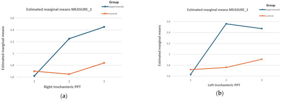 | PPT left trochanter | 1.65 ± 0.48 | 1.70 ± 0.73 | 0.05 | 0.001 * | 2.53 ± 0.46 | 1.73 ± 0.65 | 0.80 | 0.000 * | 2.48 ± 0.73 | 1.90 ± 0.75 | 0.58 | 0.003 * |