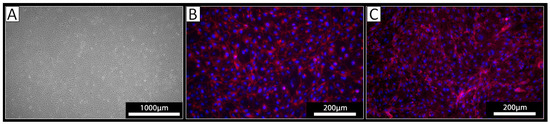 The PFA-fixed cells were washed with 500 µL PBS and blocked with 2% donkey serum in PBS for 60 min at room temperature. After discarding the blocking solution, 200 µL of 1:100 diluted rabbit anti-human CD144 antibody (AHP628Z, Bio-Rad AbD Serotec, Neuried, Germany) and 1:100 diluted rabbit IgG-Isotype control in PBS (Abcam, Cambridge, MA, USA) were applied at 4 °C overnight. Subsequently, the cells were washed with 500 µL PBS and incubated with 200 µL of a 1:300 diluted Cy3-donkey-anti-rabbit IgG (Bio-Rad AbD Serotec, Neuried, Germany) for one hour at room temperature. Afterward, the cells were washed with 500 µL of PBS and finally covered with 500 µL of PBS.
