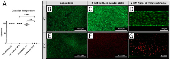 Cell viability is dependent on oxidation temperature. (A) Survival rates of PECs oxidized with 2 mM NaIO4 for 40 min at 4 °C or 37 °C with respective controls incubated with PBS (n = 3). (B–G) Exemplary pictures of a live/dead assay (green = live; red = dead) of PECs treated at 4 °C (B–D), respectively, and at 37 °C (E–G). (C,F) NaIO4 oxidation under static conditions was compared to oxidation under dynamic conditions. (D,G) Experiments were performed with cells from three different donor animals. Scale bar 1000 µm in (B,C,E,F) or 100 µm in (D,G). p-values of ≤ 0.01 (**), respectively ≤ 0.0001 (****).