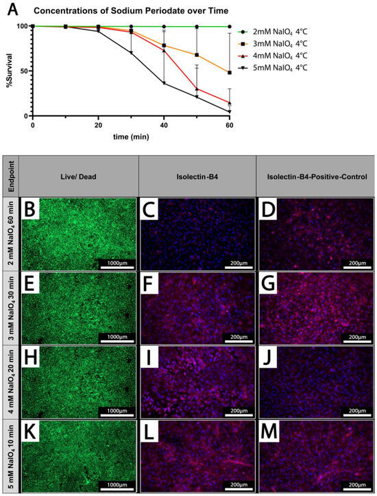Cell survival is dependent on applied concentrations and treatment duration. (A) The cell survival rate at different concentrations of NaIO4 over time; (n = 3). (B,E,H,K) Live/dead staining of PECs oxidized using 2–5 mM NaIO4 for 60, 30, 20, or 10 min. (C,F,I,L) IL-B4 staining of PECs treated with the indicated different concentrations of NaIO4 and duration. (D,G,J,M) Respective controls; PECs treated with PBS for the indicated periods. Scale bars show (B,E,H,K) 1000 µm or (C,D,F,G,I,J,L,M) 200 µm.