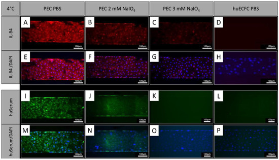 In addition to treatment under static conditions, PECs were treated with NaIO4 under dynamic conditions employing the BioFlux system. Similar to oxidation under static conditions, the cells showed a reduction in IL-B4 staining after oxidation with 2 mM NaIO4 for 60 min at 4 °C under dynamic conditions (Figure 5A,B,E,F). Oxidation with 3 mM NaIO4 for 60 min further reduced the IL-B4 staining (Figure 5C,G). Similar observations were made with human serum, which showed reduced binding of human antibodies to PECs oxidized for 60 min with 2 mM (Figure 5I,J,M,N) and a further reduction with 3 mM NaIO4 (Figure 5K,O). Human ECFCs served as negative controls and exhibited even less staining (Figure 5D,H,L,P).