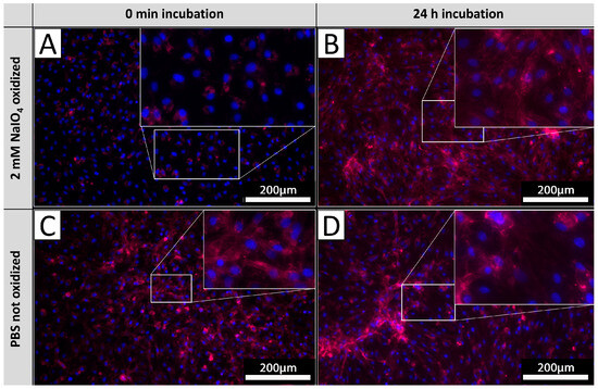 αGal turnover. PECs stained with IL-B4 (red) directly after oxidation (A) and corresponding untreated controls (B). PECs cultivated for 24 h after oxidation and stained with IL-B4 (C) and respective unprocessed control (D). The extent of areas positively detected by IL-B4 staining increases on levels of unoxidized tissues after 24 h of further incubation. Experiments were performed as biological duplicates with cells from two independent donor animals. Scale bar: 200 µm.
