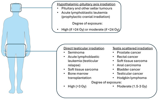 - Bang, A.K.; Petersen, J.H.; Petersen, P.M.; Andersson, A.-M.; Daugaard, G.; Jørgensen, N. Testosterone Production is Better Preserved after 16 than 20 Gray Irradiation Treatment against Testicular Carcinoma In Situ Cells. Int. J. Radiat. Oncol. Biol. Phys. 2009, 75, 672–676. [Google Scholar] [CrossRef]