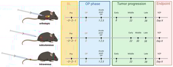 Figure 1. Experimental design for longitudinal evidence-based animal welfare assessment in cell line-derived cancer models. Distress assessment was performed on days −3 to −1 before any intervention (Pre) to determine the baseline values (BL) of healthy mice at the day of cancer cell injection (day 0, OP), on post-operative days 1–3, and during the early, middle, and late phase of tumor progression and on the days before the individual humane endpoint. Created with BioRender.com.