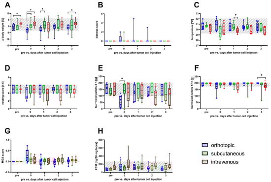 Figure 2. Animal distress was quantified before and after the orthotopic, subcutaneous, and intravenous cell inoculation. Body weight change (A), distress score (B), perianal temperature (C), nesting (D), burrowing after 2 and 17 h (E,F), mouse grimace scale (G), and fecal corticosterone metabolites (H) were evaluated before (pre, overall range shaded gray), on the day of intervention (0), and the following recovery days (1–3). Statistical analysis was carried out with repeated measures two-way ANOVA, followed by Dunnett’s test for comparison to baseline within the models and Tukey’s test for inter-model differences. (* p ≤ 0.05, significant differences to the pre-values within each model for (a) orthotopic (n = 5–9), (b) subcutaneous (n = 7–9), (c) intravenous (n = 6–8)).