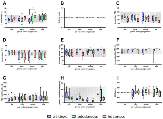 Figure 3. Animal welfare assessment during tumor progression for the orthotopic, subcutaneous, and intravenous pancreatic cancer model. Body weight change (A), distress score (B), perianal temperature (C), nesting behavior (D), burrowing activity after 2 and 17 h (E,F), concentration of fecal corticosterone metabolites (G), plasma corticosterone concentration (H), and mouse grimace scale (I) were evaluated before tumor cell injection (pre, overall range shaded gray) and during early, middle, and late phase of tumor progression. Statistical analysis was carried out with repeated measures two-way ANOVA (A,CF) or mixed-effects model (B,GI), followed by Dunnett’s test for comparison to baseline within the models and Tukey’s test for significance of inter-model differences. (* p ≤ 0.05, significant differences to the pre-values within each model for orthotopic (n = 4–9); (b) subcutaneous (n = 7–9), (c) intravenous (n = 6–8)).