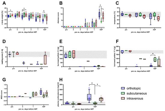 Figure 4. Severity assessment parameters are monitored until the individual humane endpoint in the orthotopic, subcutaneous, and intravenous pancreatic cancer model. Body weight change (A) and distress score (B) were continuously monitored before (overall range shaded gray) as well as on the four days before and the day of the humane endpoint (4, 3, 2, 1, and hEP). Perianal temperature (C), nesting (D), burrowing activity after 2 and 17 h (E,F) were assessed for the last two days (1, hEP). Mouse grimace scale (G) was evaluated from day two before the humane endpoint until the end of the experiment (2, 1, hEP). Plasma corticosterone concentration (H) was measured on the day of the individual humane endpoint. Statistical analysis was carried out with repeated measures two-way ANOVA (A,B,H) or mixed-effects model (CG), followed by Dunnett’s test for comparison to baseline within the models and Tukey’s test for inter-model differences. (* p ≤ 0.05, significant differences to the pre-values within each model for (a) orthotopic (n = 3–9); subcutaneous (n = 3–7), (c) intravenous (n = 4–7)).