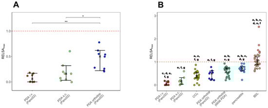 Figure 5. Between-model comparison of severity by RELSAmax. The distress of the intravenous (i.v.), subcutaneous (s.c.), and orthotopic (orthotop) pancreatic cancer models using the Panc02 cells was evaluated with the RELSAmax values. Significant differences between the RELSAmax estimates of the different models were evaluated by the Kruskal–Wallis test (Χ2 = 14.048, df = 2, p-value = 0.00089) (A). The RELSAmax estimates of the pancreatic cancer models were also compared to other murine gastrointestinal animal models such as CCl4 (model for liver fibrosis), PDA orthotop 6606PDA (orthotopic pancreatic cancer model with 6606PDA cells), pancreatitis, and BDL (bile duct ligation model). Significant differences between the RELSAmax estimates of the different models were evaluated by the Kruskal–Wallis test (Χ2 = 83.345, df = 6, p-value = <0.0001) (B). PDA i.v. (Panc02): n = 8 Ȓ = 0.075, CI95% = [−0.049;0.199]; PDA s.c. (Panc02): n = 9, Ȓ = 0.177, CI95% = [0.060;0.294]; PDA orthotop (Panc02):Ȓ = 0.440, CI95% = [0.323;0.557]; CCl4: n= 22, Ȓ = 0.401, CI95% = [0.293–0.510]; PDA orthotop (6606PDA): n = 26, Ȓ = 0.698, CI95% = [0.507;0.706]; pancreatitis: n= 16; Ȓ = 0.698, CI95% = [0.571;0.825]; BDL: n = 30, Ȓ = 1.102, CI95% = [1.009–1.194]. The graph displays RELSAmax values obtained from individual RELSA analyses, the bootstrapped median estimator, and the 95% confidence intervals. Significant differences indicated by (A): * p ≤ 0.05 and ** p ≤ 0.01; (B): significant different (p ≤ 0.05) to a (PDA i.v.), b (PDA s.c.), c (CCl4), d (PDA orthotop (Panc02), e (PDA orthotop 6606PDA), f (pancreatitis), and g (BDL).