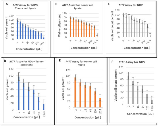 Per manufacturer instructions, cell viability was determined using an MTT assay [27], Kit (#CGD1-1KT, Sigma-Aldrich, St. Louis, MO, USA). HCT116 and HT-29 tumor cells (4 × 104 cells/mL) were grown in DMEM with 10% FBS for three hours. After adding 100 μL of this cell suspension to each well of a 96-well microtiter plate, the plate was put in an incubator at 37 °C and 5% CO2 overnight to enable cell adherence before any treatments were applied. After 24 h, fresh DMEM with 20 μL serial dilutions of each treatment was introduced. The three treatments were the virus alone, tumor cell lysate, and both. Duplicate controls of untreated cells were created. The cells returned to the incubator for 24 h. Then, 120 μL was carefully pipetted, and 100 μL of 10% MTT solution in the medium in each plate was added per well; three to four hours of incubation followed. After incubation, the purple formazan crystals were dissolved by removing the culture medium and adding an equal amount of culture media and 100 μL of MTT solvent into each well. After that, the plate was placed on a plate shaker for thirty minutes at 120 rpm until a consistent color was discovered, indicating that all crystals had dissolved. Finally, a spectrophotometer at 570 nm calculated the crystals’ concentration.