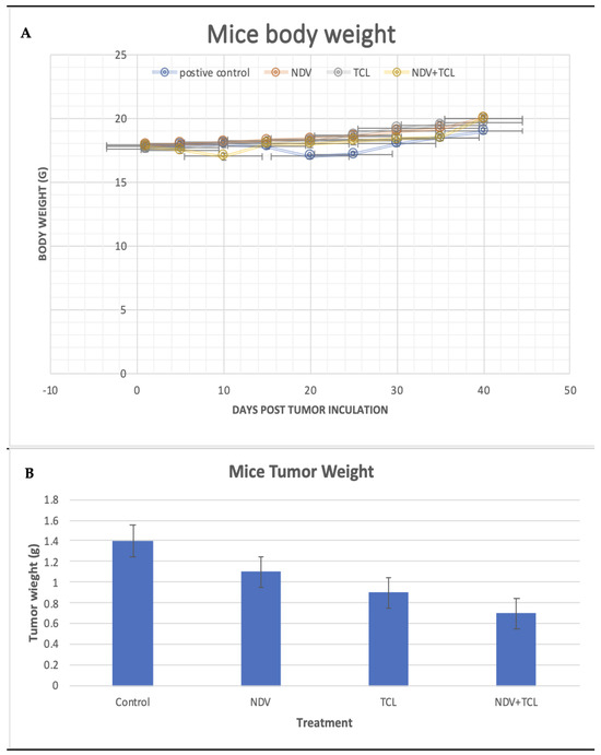 Mice’s body weight was measured every week; there was no actual change among treatment groups regarding body weight (Figure 4A). However, the body weights of the negative control mice increased over time compared to the positive control group. The latter showed the lowest body weight by the end of the experiment (i.e., 19.8 g), and the NDV+TCL, together with NDV alone treated groups, hit the highest weight at 20.3 and 20.14 g. At the same time, the body weight of the TCL-treated group was approximately 19.79 g (means of repeated measures, p = 0.369).