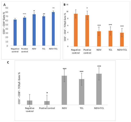 On the other hand, the T cell receptor (TCR), an antigen-specific receptor found on T cells (helper and cytotoxic T cells), and its presence as TCR chain γδ was assessed using gate percentage. TCRγδ, when gated with CD3+ CD4+, showed higher expression levels of negative control than positive control (9.4%, 9%, respectively). At the same time, treatment groups NDV and TCL NDV with TCL gave much lower significant levels (4.4%, 4.5%, 4%, respectively), where p = 0.0001, 0.0004, and 0.0009, respectively (Figure 6B). While TCRγδ gated with CD3+, CD8+ had the highest expression in the NDV+TCL group (74.3%), followed by NDV and then TCL-treated groups (70.2% and 61.7%, respectively). Meanwhile, the most negligible results with positive controls and negative controls reached 10% and 9.2%, respectively, with p = 0.0008, 0.0007, and 0.0009 (Figure 5C).