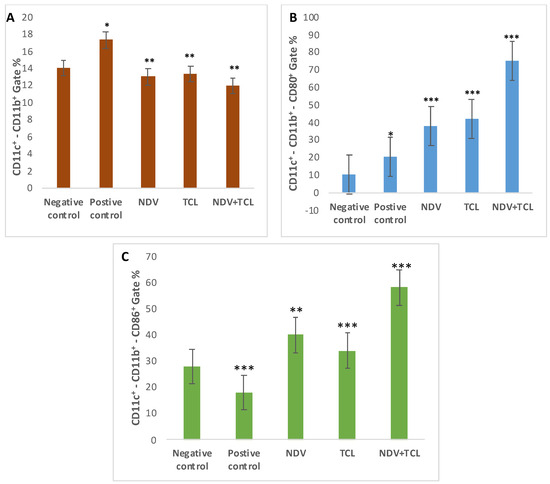 Myeloid DCs CD11c and CD11b are used for DC evaluation. They showed high statistical values in tumor-positive controls (17.3%) (Figure 7A). CD80 and CD86 usually assess the maturity of DCs. Gating with CD11c+ and CD11b+, CD80 was statistically highly expressed in the NDV with TCL treated group (75.2%), p = 0.00075 (Figure 7B). Furthermore, CD86+ was statistically highly expressed in the same group with the same gating (58.1%) (Figure 7C).