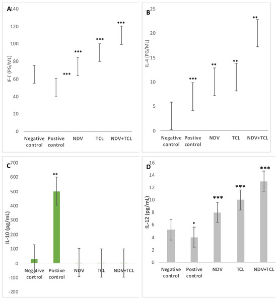 For IL-12, the negative control’s mean (5.72 ± 2.90 pg/mL) was higher than that of the positive control (4.21 ± 1.90 pg/mL). The highest expression was observed in the means of the treated groups with NDV, TCL, and NDV with TCL (8.11 ± 1.91, 10.20 ± 1.83, and 13.5 ± 0.89 pg/mL, respectively).