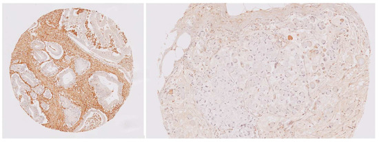 Examples of Gal-1 staining. Left: moderate to intense positivity in the stroma. Gal-1 IHC, ×100. Right: mild positivity in the stroma. Gal-1 IHC, ×200.