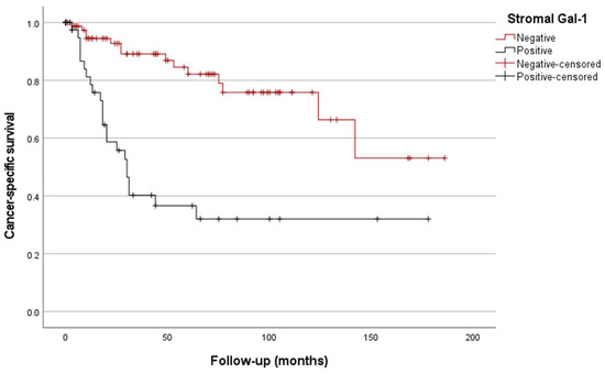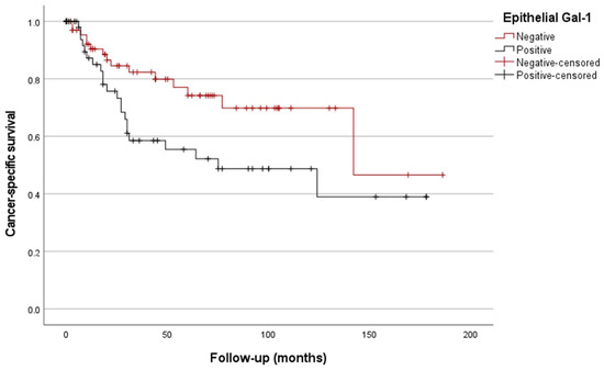 Similarly, the classification of the patients based on the epithelial Gal-1 expression also showed significant prognostic differences (estimated mean CSS of 129 vs. 95 months; p = 0.037, Figure 6).