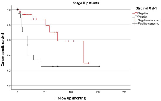 Kaplan/Meier curves for CSS demonstrated that increased stromal Gal-1 expression was associated with significantly worse CSS compared to the patients without Gal-1 overexpression (estimated mean CSS of 139 vs. 72 months, respectively; p < 0.001, Figure 4). Furthermore, positive stromal Gal-1 expression stratified the stage III patients into two subgroups with significant prognostic differences (estimated mean CSS of 97 vs. 50 months; p = 0.002, Figure 5).